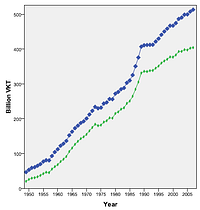 Vehicle kilometers of travel in the UK 1950-2005. Blue = all road traffic, green = car traffic only.Source: Imperial College.