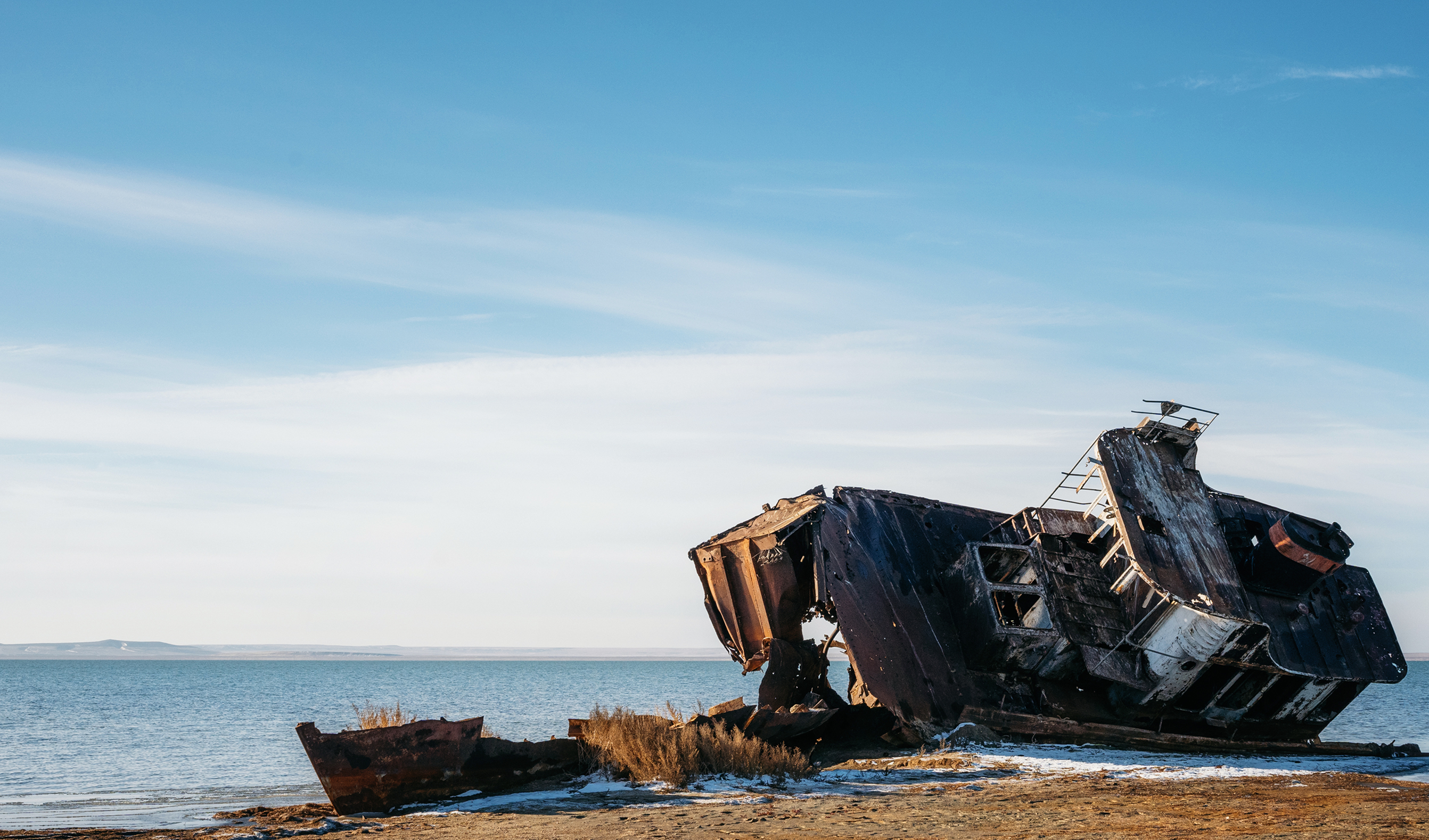 The drying up of the Aral Sea is one of the greatest environmental disasters of our time, caused by human overuse of water resources in Central Asia. Today, only the northern part, the Small Aral Sea, still receives inflow and can support fish production. The remaining areas are too saline to sustain life. The environment around the former shorelines has turned into desert, where unemployment, disease, and poverty are widespread. Winds carry toxic dust from dried-up pesticides, contaminating the soil, air, and water.